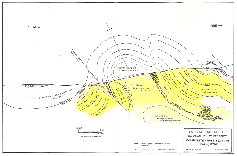 The Property is underlain by a package of bimodal volcaniclastic rocks assigned to the McLaughlin Ridge Formation (MRF) of the Devonian Sicker Group, which hosts all of the massive sulphide mineralization. The MRF occurs at the core of an open anticline and is flanked by sedimentary rocks of the overlying Carboniferous-Permian Fourth Lake Formation of the Buttle Lake Group. These rocks have all been intruded by gabbros coeval with the Upper Triassic Karmutsen Formation, which together are unconformably overlain by clastic sediments of the Upper Cretaceous Nanaimo Group. Late, brittle faults, including at least one splay of the Fulford Fault, cut all these rocks.