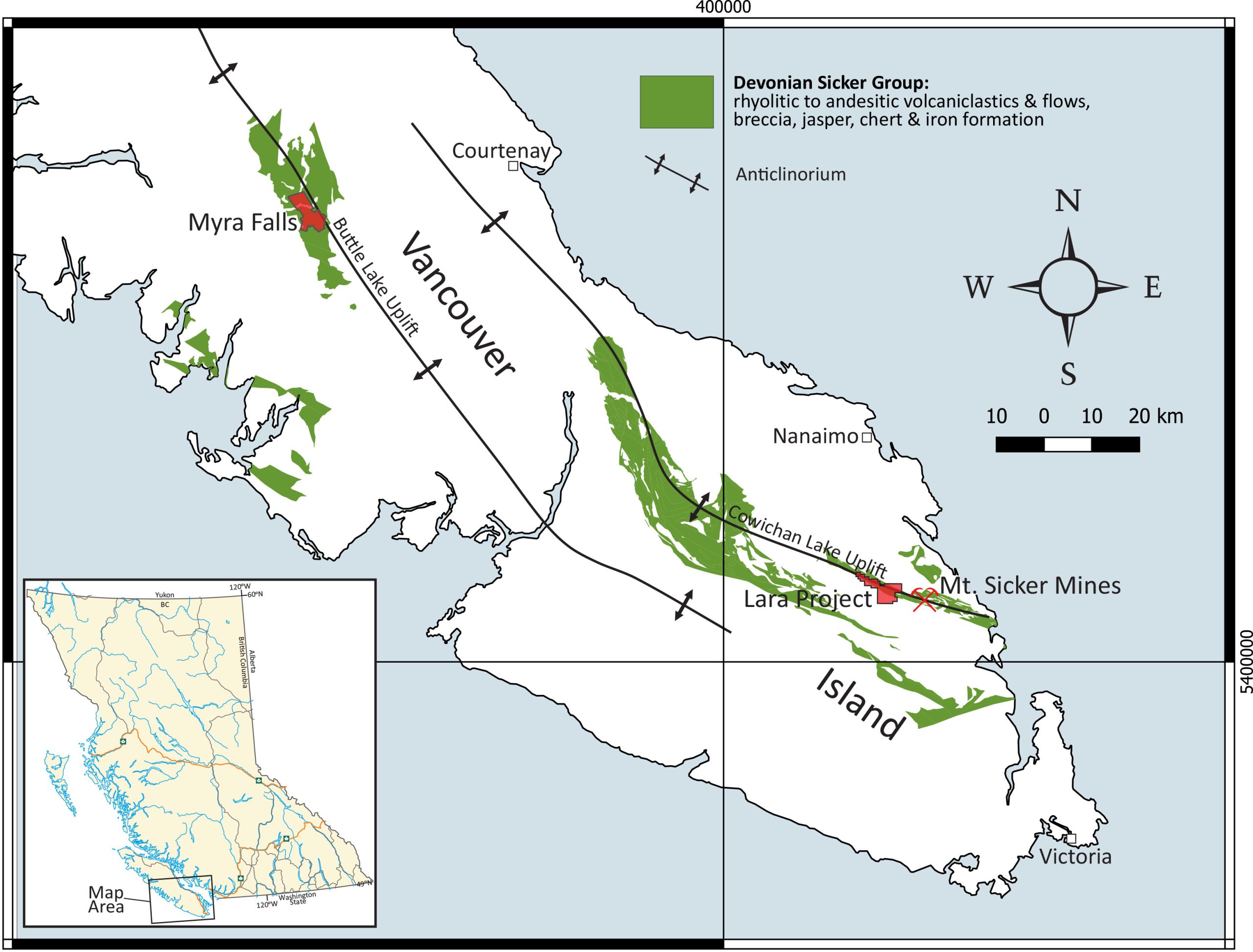 The Lara Project contains a polymetallic volcanogenic massive sulphide (VMS) deposit hosting gold, silver, copper, zinc, and lead. The Property is underlain by the McLaughlin Ridge Formation (Cowichan Lake uplift) which is correlative with the Myra Formation (Buttle Lake uplift) sequence of bimodal volcaniclastic rocks that hosts the Zinc (Zn)-Lead (Pb)-Copper (Cu)-Silver (Ag)-Gold (Au) VMS deposit of Myra Falls (~145 km to the north). The past producing Zn-Cu-Pb-Ag-Au mine and mineralized zones at Mt. Sicker, ~9 km southeast of the Property, are also hosted by the McLaughlin Ridge Formation (Belik, 1981; MINFILE, 1990a).